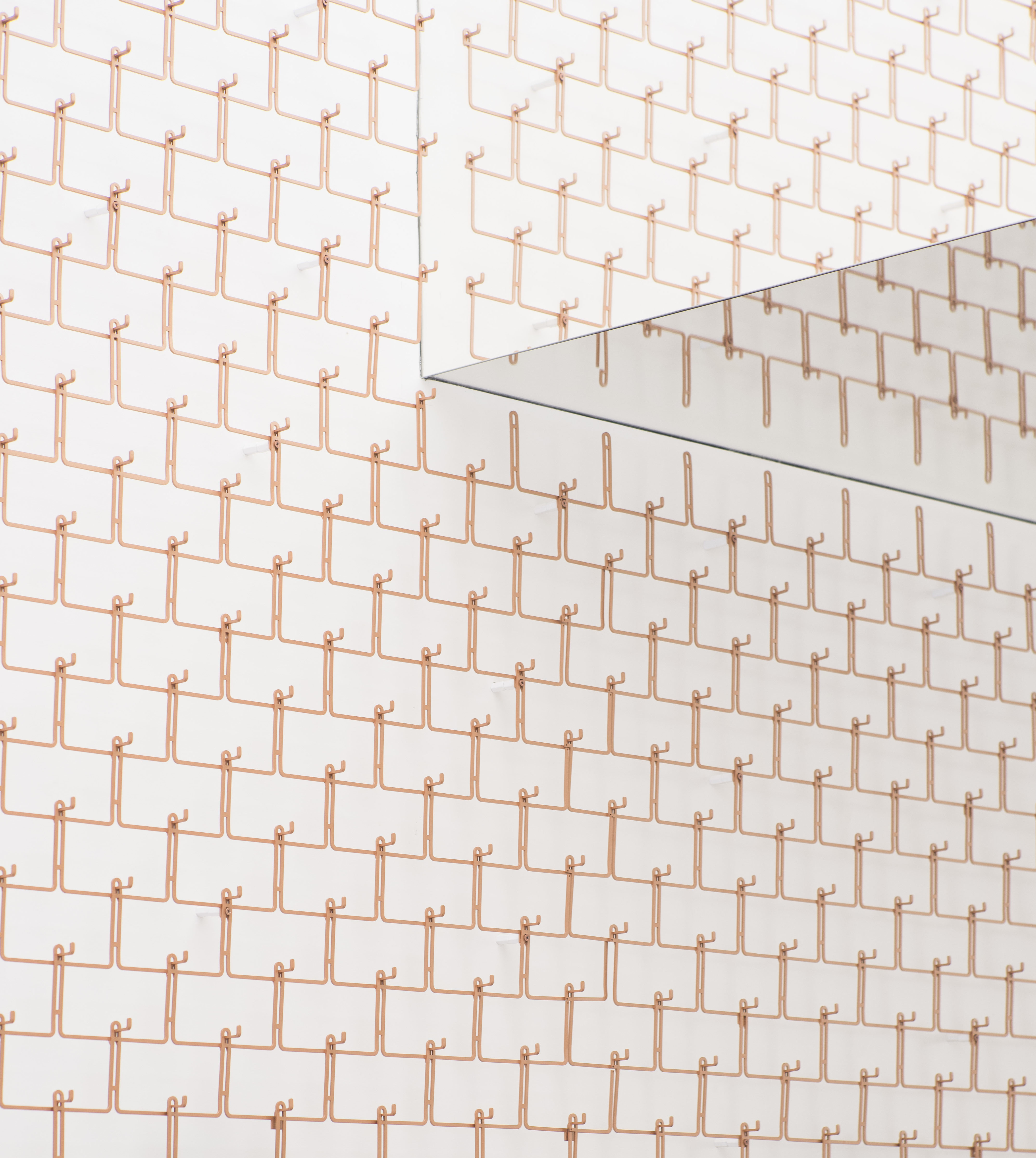 The external face consists of a hidden support frame 50/50/3mm which was covered by 2mm sheet metal painted in the color of copper. At a distance of 15cm from this lining, the final outer surface was placed, which also consists of 2mm corrugated sheet metal, painted white while the pattern shown was laser cut.